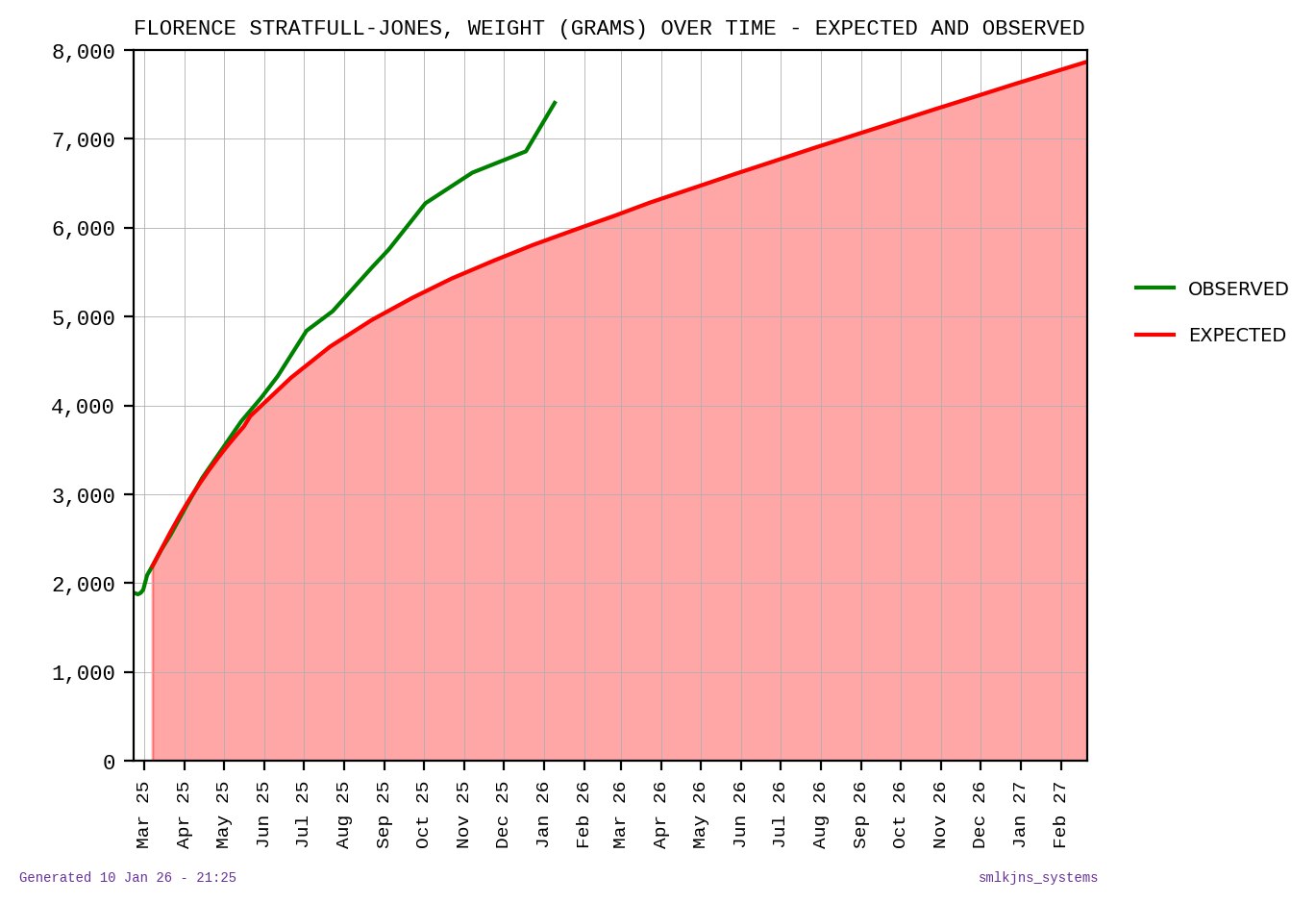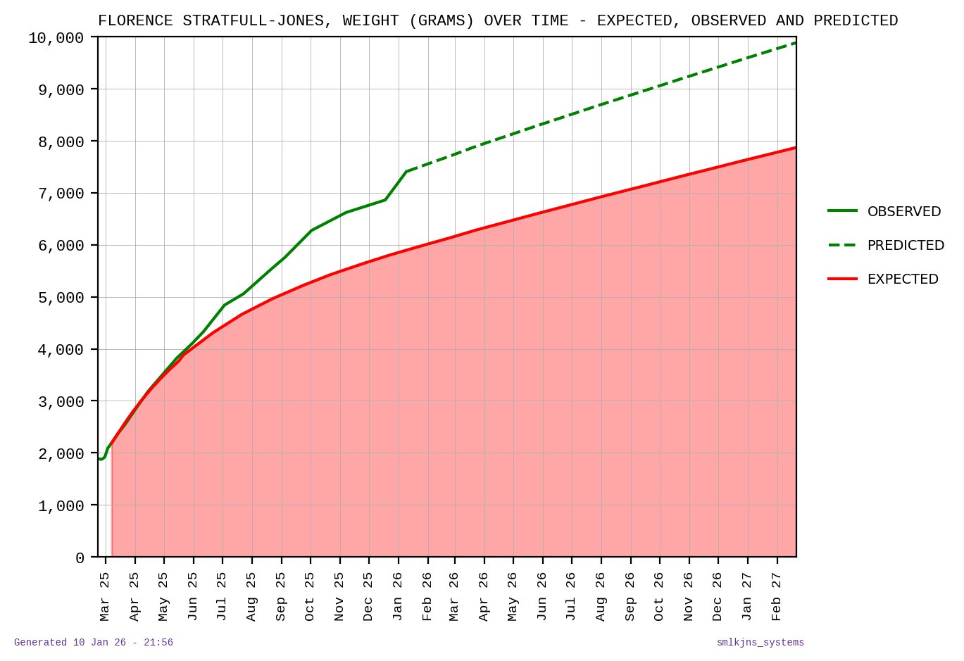With Florence’s weigh-ins stored by smlkjns_assistant, I can finally plot her weight trend against the expected trend specific to her. Here it is: