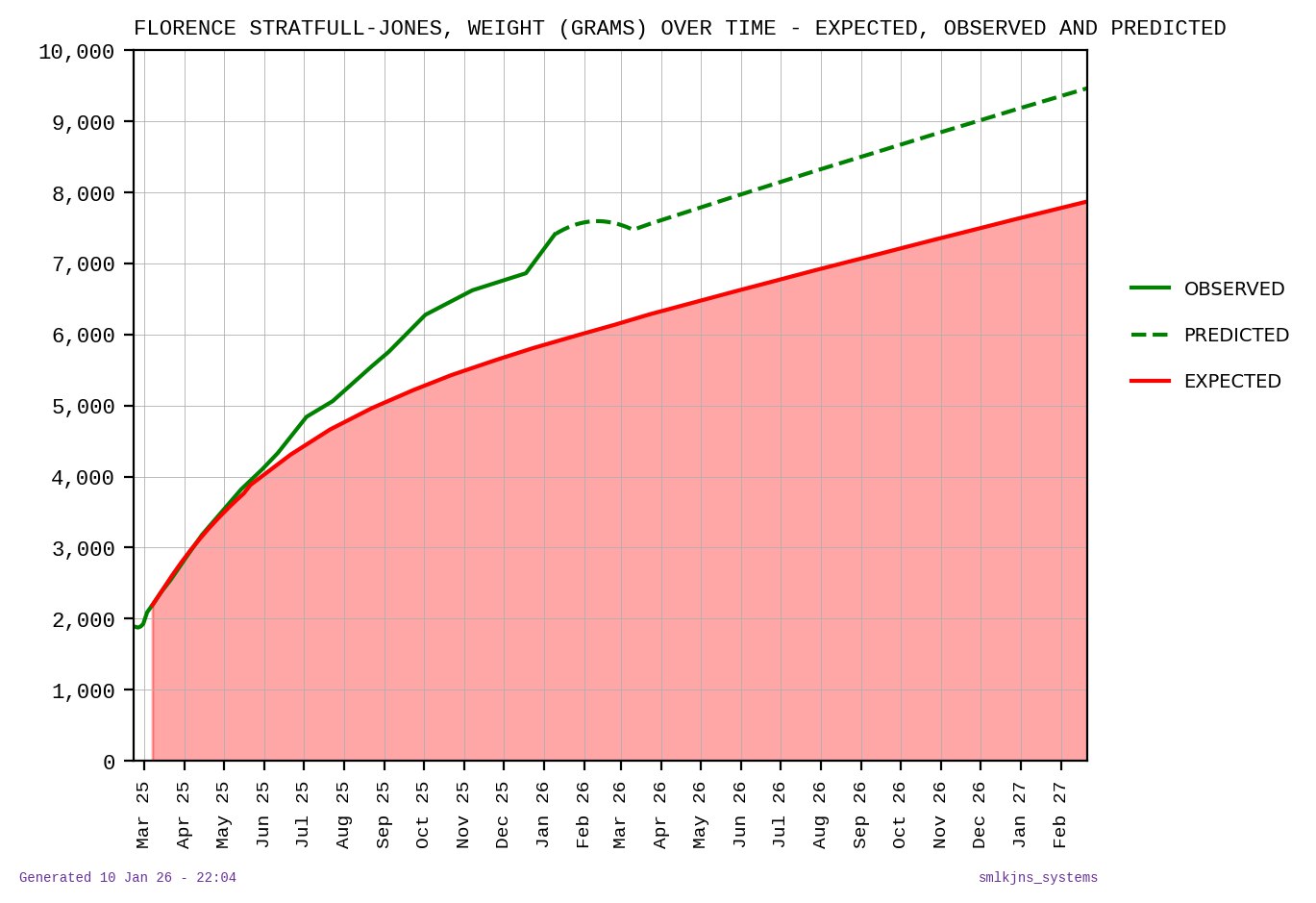 Aside from making me feel much happier that she is actually gaining enough weight, calculating her expected trend also allows us to predict when she’ll reach a given weight, something that’s very useful to us given the number of Florence-accessories we have in various forms that she was born a long way below the minimum recommended weight for.