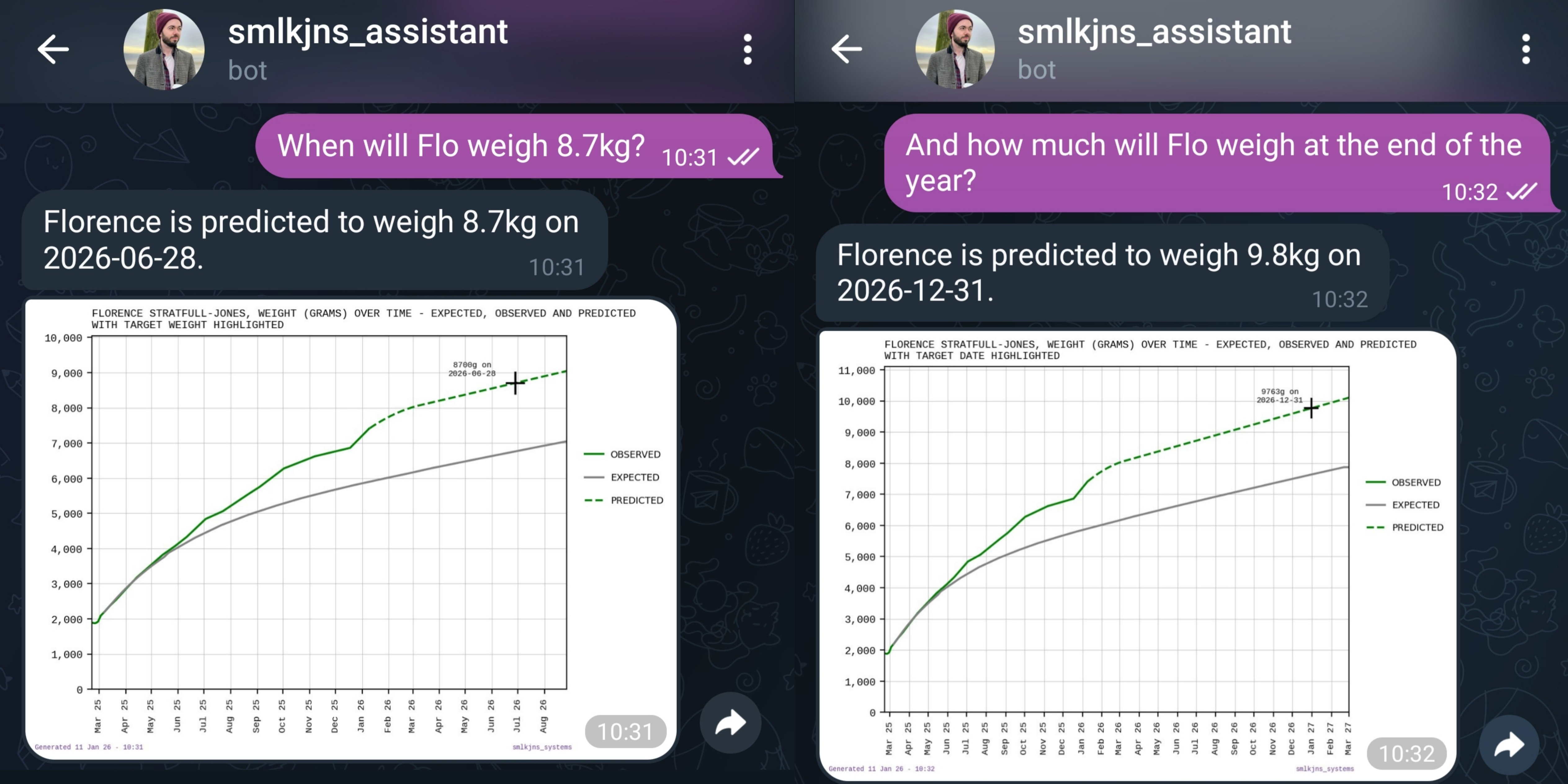 A common game in our house is trying to figure out when Flo will fit into a given item of clothing. With that in mind, I thought it would be useful to have smlkjns_assistant be able to answer queries based on this data about when she’ll reach a given weight, or what weight she’ll be on a given date.